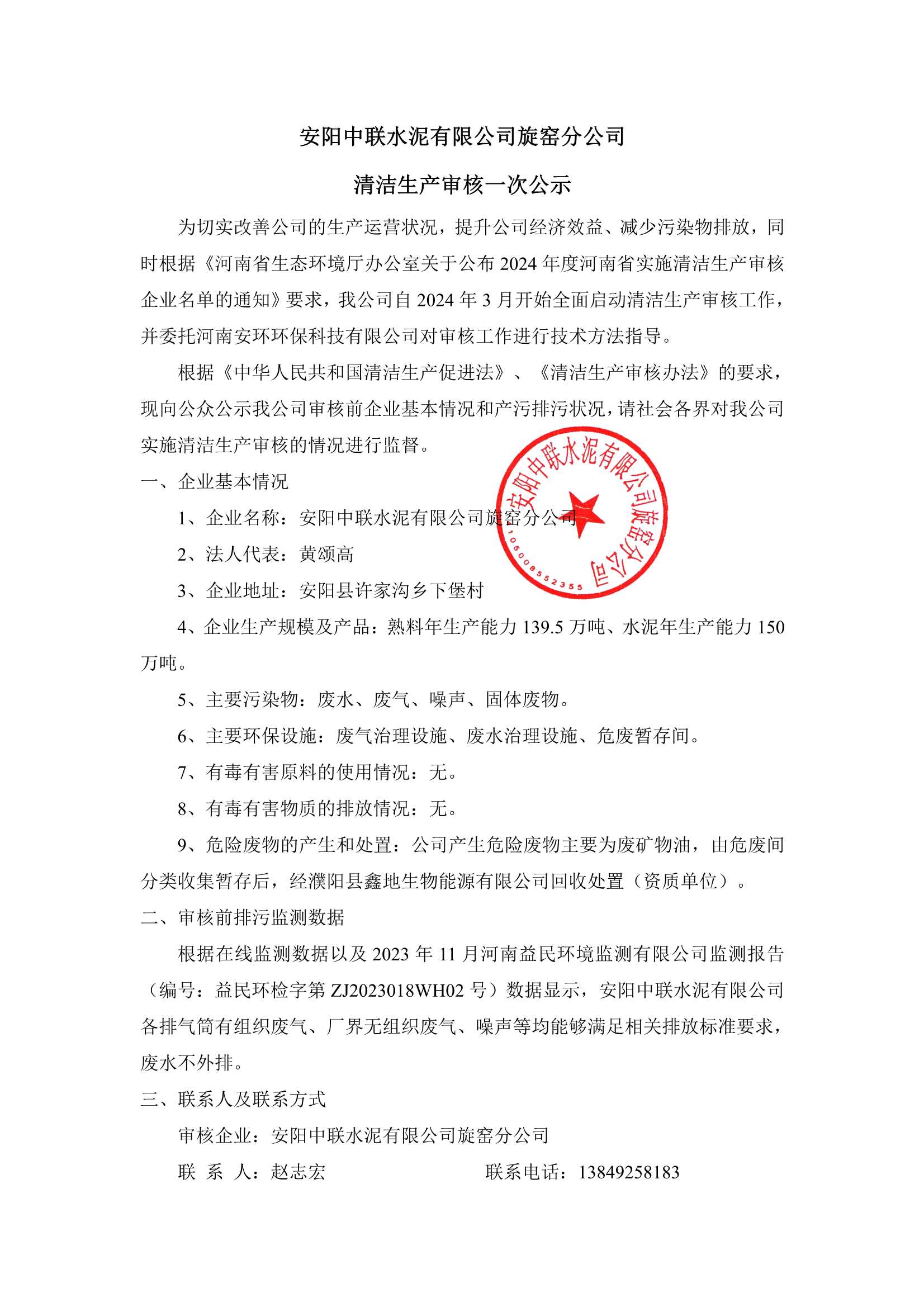 安阳yl23411永利官网登录水泥有限公司旋窑分公司突发环境事件应急预案公示